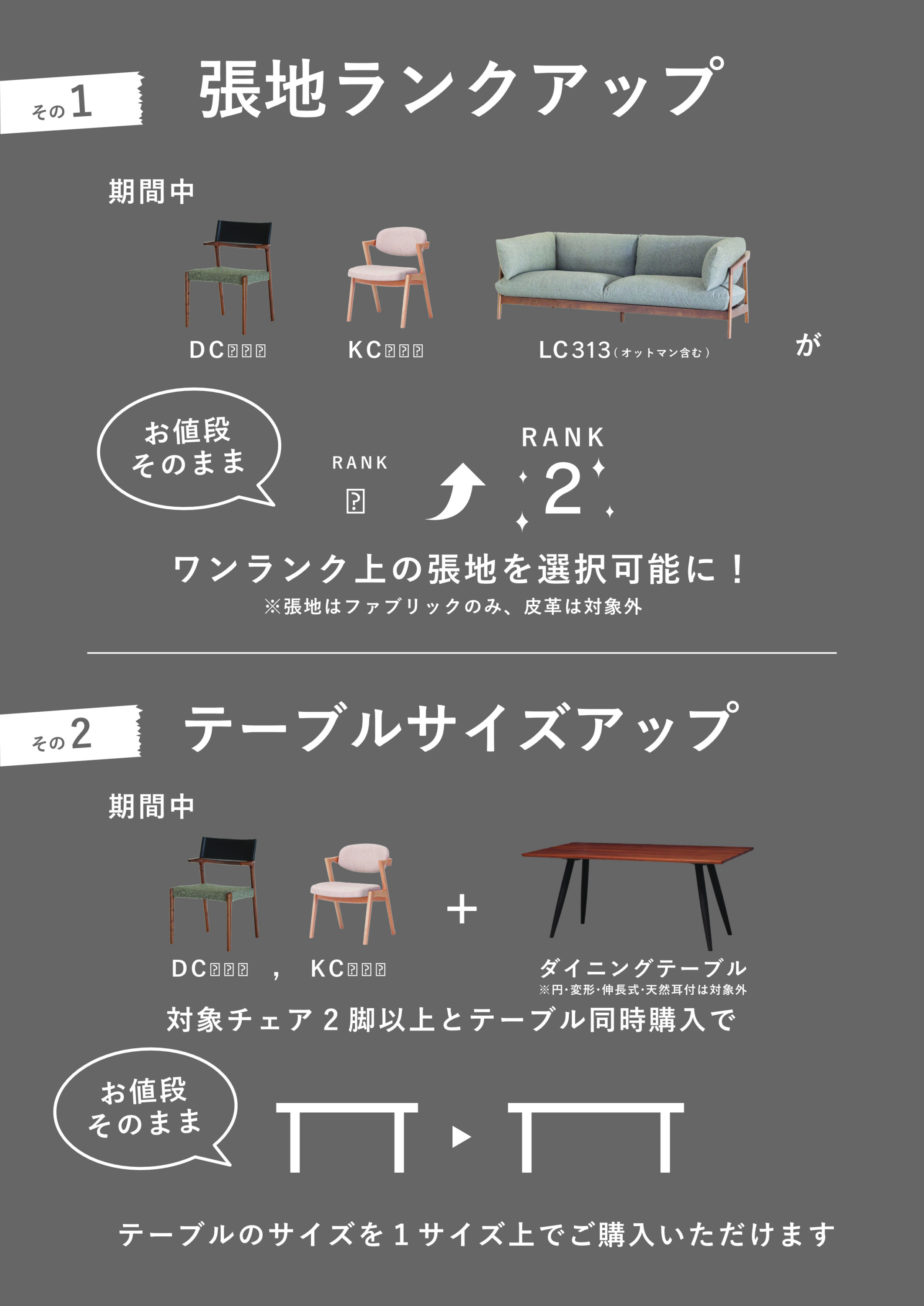 ①期間中にDC367・KC056・LC313をご購入いただいたお客様の張地ランクを無料でアップグレード。