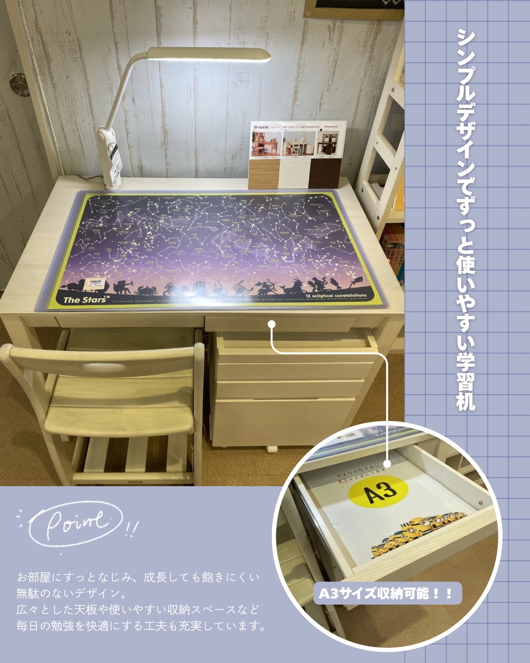 お部屋にすっと馴染みやすく、成長しても飽きにくいシンプルなデザインが特徴の学習机です。